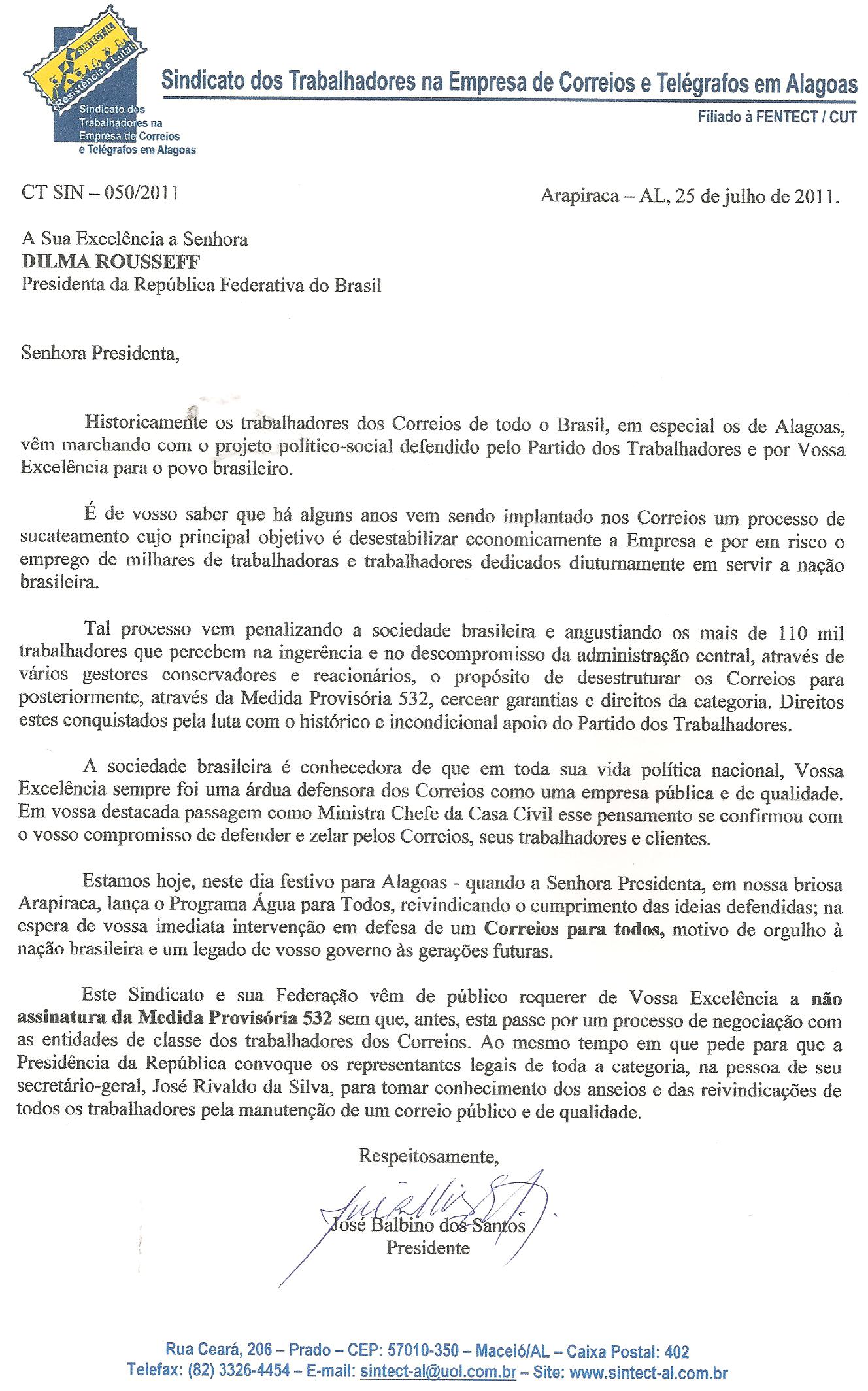 Na correspondência, conforme anexo, o Sintect-AL relata os riscos que a MP 532 pode gerar para o futuro dos trabalhadores da ECT.