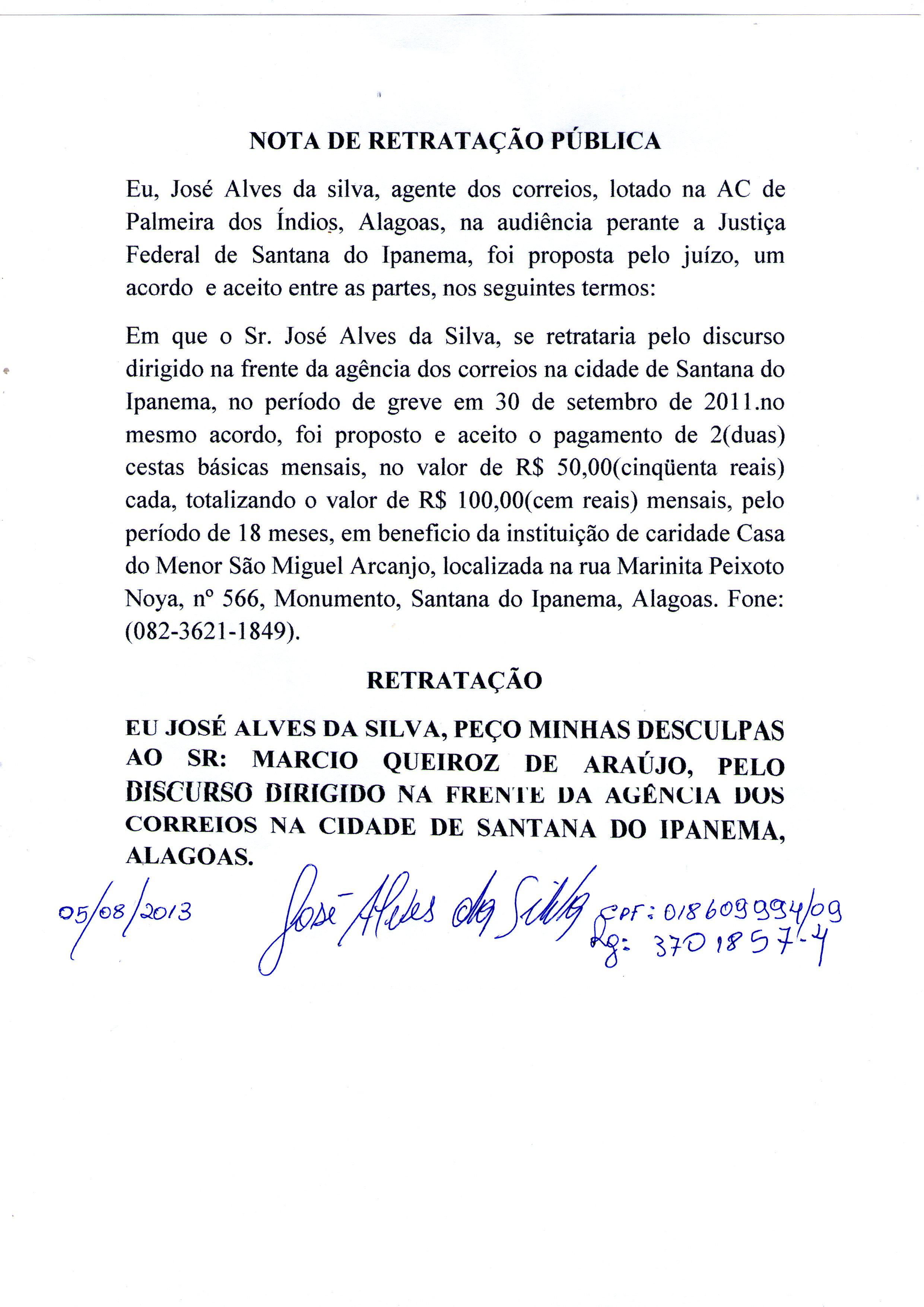 O Sintect-AL, a pedido do sindicalizado e funcionário dos Correios, José Alves da Silva, torna pública a presente nota de retratação. O leitor, também pode conferir o documento, em anexo, assinado pelo sindicalizado.